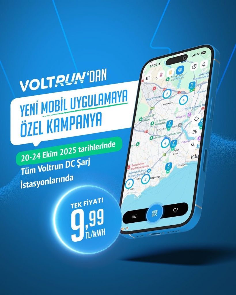 Yeni mobil uygulamamız, şarj deneyiminizi daha hızlı, kolay ve keyifli hâle getiriyor. Bu deneyimi daha da avantajlı kılmak için 20 – 24 Ekim 2025 tarihleri arasında tüm Voltrun DC şarj istasyonlarında aracınızı sadece 9,99 TL/kWh sabit fiyatla şarj edebilirsiniz!